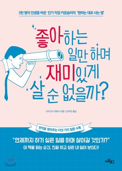 "언제까지 하기 싫은 일을 하며 살아갈 것인가?" 3천 명의 인생을 바꾼 인기 직업 카운슬러의 원하는 대로 사는 법. 이 책을 읽는 순간, 진짜 하고 싶은 내 일이 보인다! 애쓰지 않아도, 좋아하는 일만 하며 살아갈 수 있다면 얼마나 행복할까? 더군다나 하고 싶은 일을 했을 뿐인데, 일도 잘 풀리고, 인간관계도 편해지며, 돈도 많이 벌 수 있다면 사는 게 너무나 즐거울 것이다. 이 책은 다른 사람에게 잘 보이기 위해, 부모의 기대에 부응하느라, 실패하는 게 두려워서 자신의 몸과 마음을 갉아먹으며 살아가는 사람들을 위해 쓰였다. 저자는 일하는 자신의 얼굴이 행복해 보이지 않는다면, 근본적인 삶의 방식을 다시 고민해봐야 한다고 말한다. 지금 우리에게 필요한 것은 '하기 싫은 일을 어떻게 해낼 것인가'가 아니라 하고 싶은 일만 하며 어떻게 살아갈 것인가'를 아는 것이기 때문이다. 이 책은 '싫어도 필요하면 해야 해' '노력 없이 되는 건 없어'처럼 우리 사회에 만연해 있는 잘못된 성공 의식에 반기를 들며, '원하는 일만 하며 살아도 괜찮다'는 새로운 관점을 제안한다. 또 단 하루를 살더라도 재미있고 행복하게 살고 싶은 사람들에게 '천직을 찾아주는 다섯 가지 질문' 등을 통해 좋아하는 일을 평생 직업으로 만드는 현실적인 방법도 알려주고 있다. 그러니 이 책을 읽고, 오늘부터 작은 행동이라도 바로 실천해보면 어떨까? 좋아하는 일만 하며 살기에도 인생은 짧으니까!