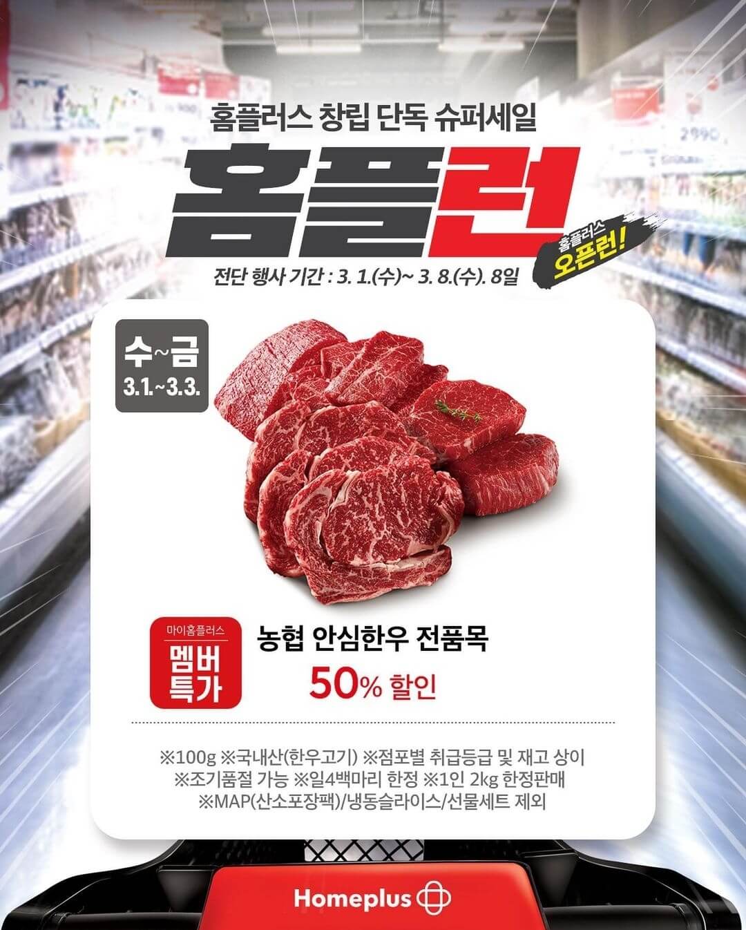 3월 6일부터 7일 까지 냉동생지, 7일부터 8일까지 네오플램, 8일에는 한우 전품목을 50% 할인합니다. 홈플러스 온라인몰에서 3월 1일부터 15일까지 '마트직송'에서 1회 이상 구매시 애플리케이션 (앱) 전용 5000원 쿠폰을 증정한다고 하니 눈여겨보시기 바랍니다.