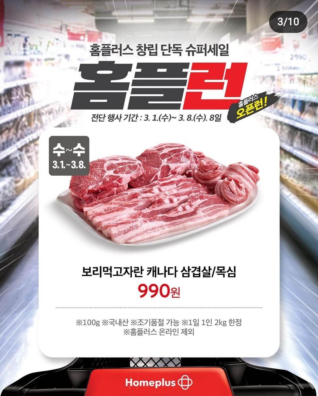 ◆ 보리먹고 자란 캐나다 삼겹살 목심 990원