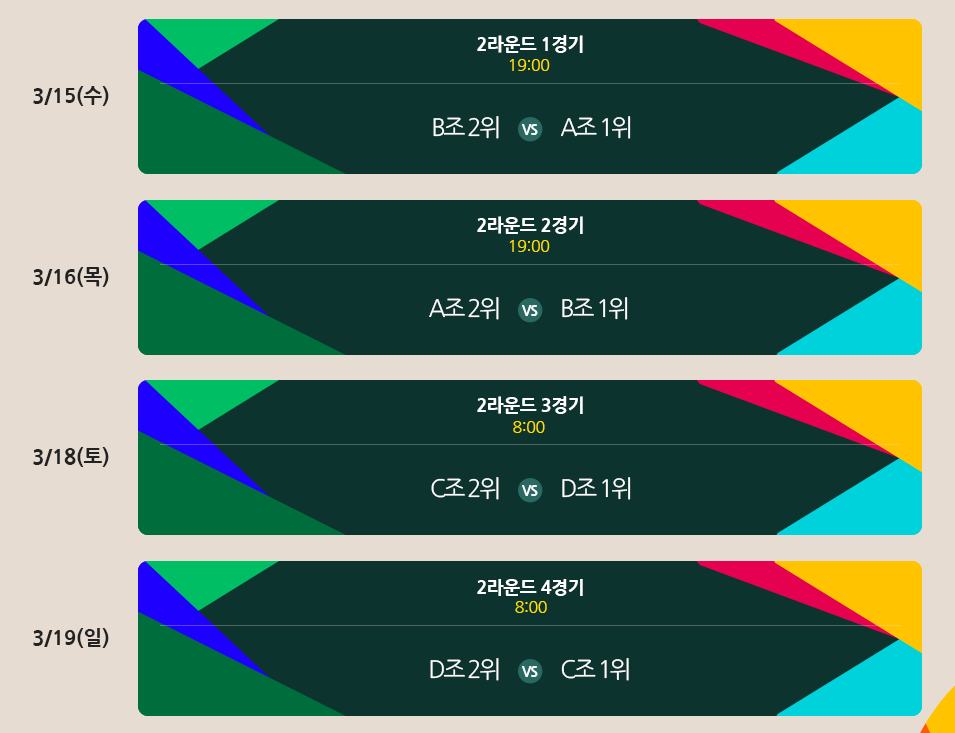 - 4경기 : D조 2위 VS C조 1위 (3월 19일 오전 8시 : 미국 마이애미 론디포 파크)