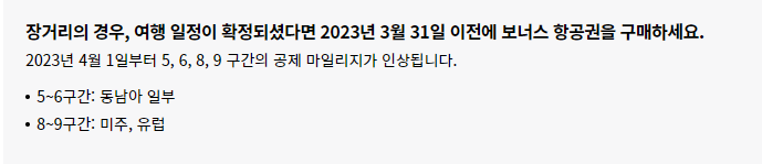 만약 장거리 여행을 계획 중이라면, 2023년 3월 31일 이전에 보너스 항공권을 구입하는 것이 좋습니다. 발권만 4월 1일 이전에 하면 출발날짜와 상관없이 이전 제도로 더 저렴하게 보너스 항공권을 구입할 수 있습니다.