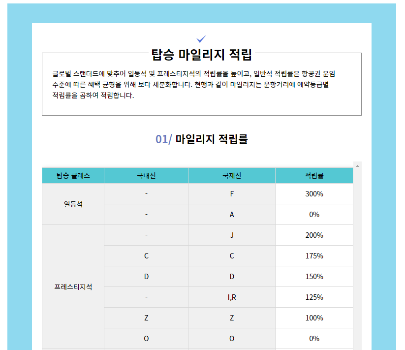 마일리지 제도 개편으로 일등석과 프레스티지석의 탑승 마일리지 적립율은 상승 했습니다. 그러나 일반석의 탑승 마일리지 적립율은 하양 조정 되었습니다.
