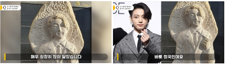 또 그는 "1층에 자리잡고 있는 불상인 '세상속의 붓다'는 누군가와 매우 굉장히 닮았다. 바로 정국이다. 헤어스타일부터 손가락 하트 얼굴까지 판박이다. 이 불상은 한 아이돌 멤버가 기증한 것으로 알려졌다."고 주장했다.